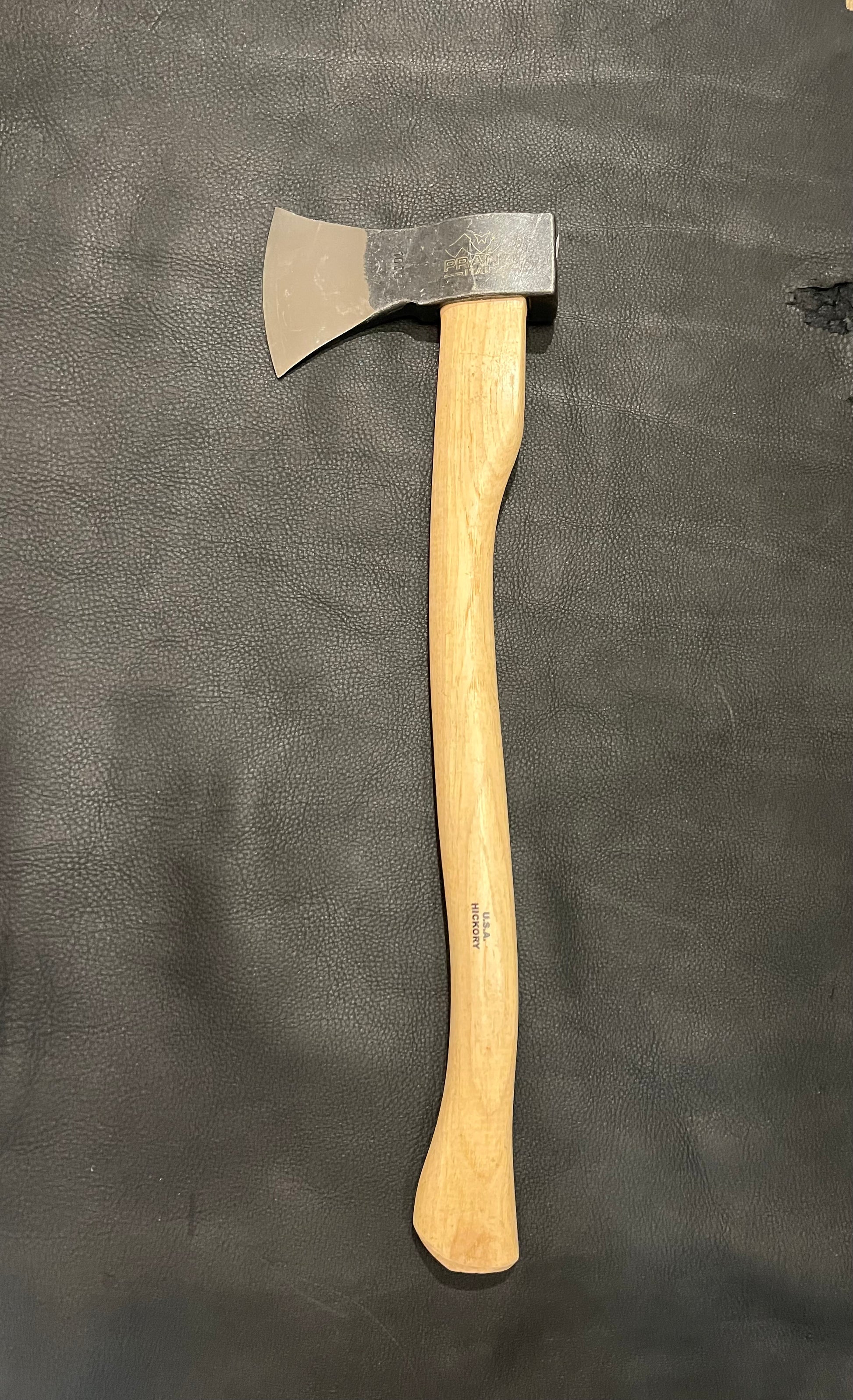 The German style throwing axe measures 25" overall. 7.5" natural carbon steel axe head with 4.25" cutting edge. Hickory handle. 2.25lb. Axe head. This would make a great addition to your canoe and camping axe. It is just a little bigger head and a handle that can that can wield with two hands.