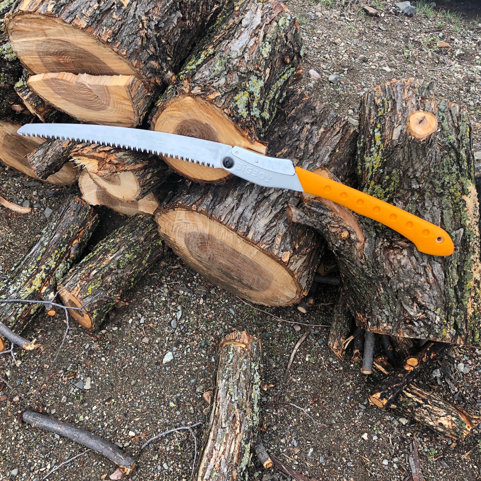 Multi-purpose folding saw with a 14-1/5-inch curved blade for a greater reach. It is equipped with a perfectly-balanced uniquely-shaped low angle curve (2,000 mm radius of the blade), hard chrome-plated blade. The low angle curve enables cutting branches smoothly and incredibly fast. Features extra large teeth